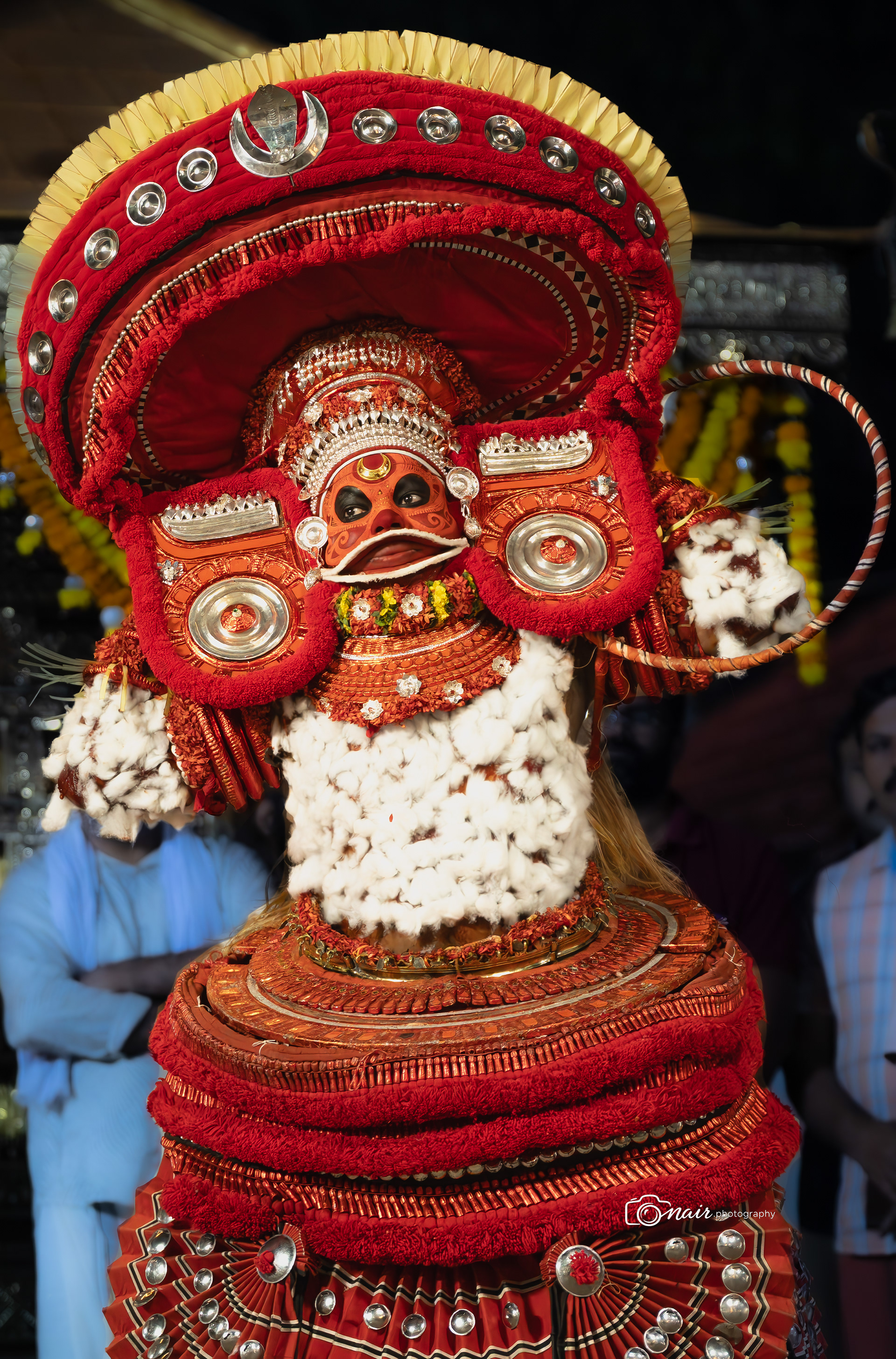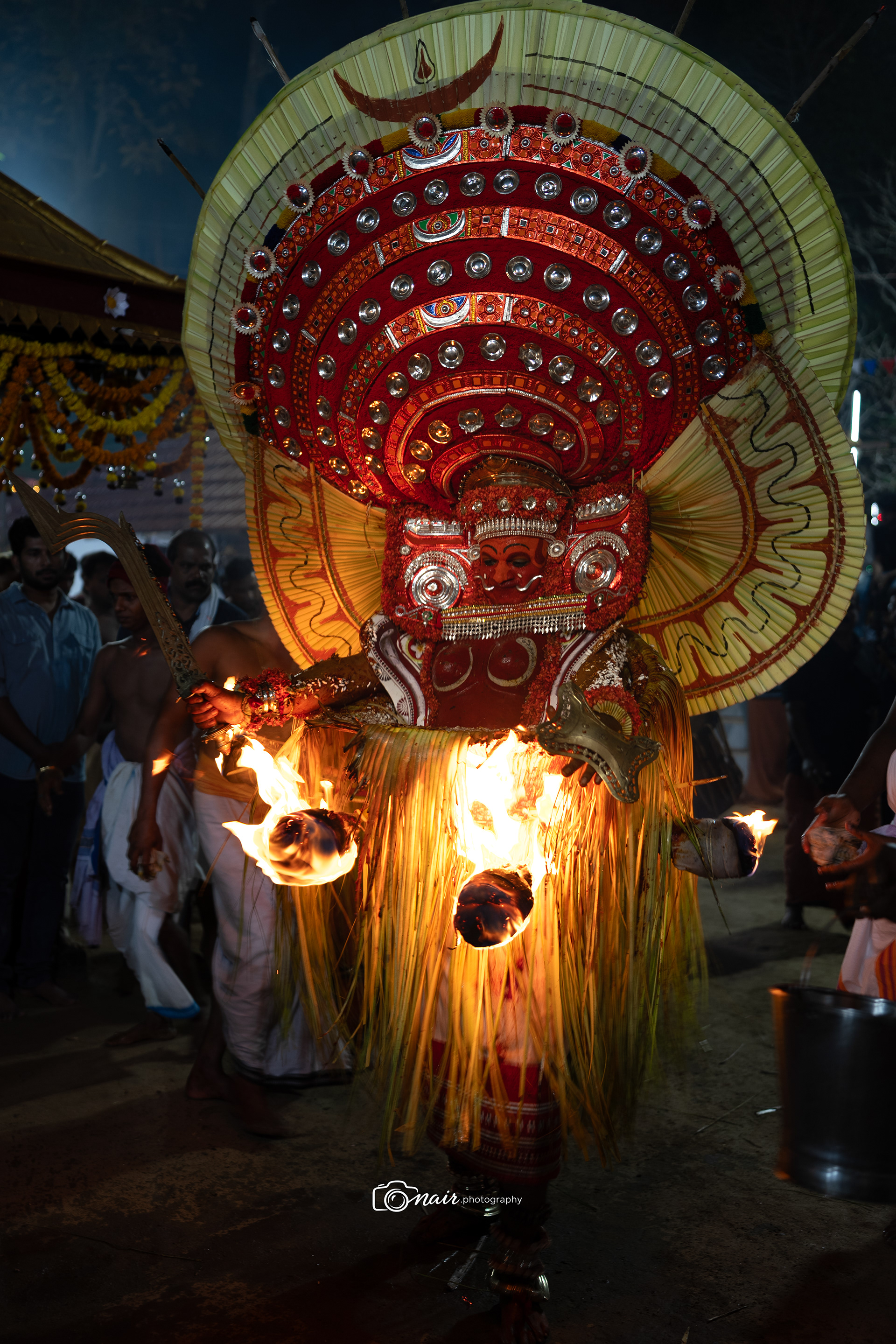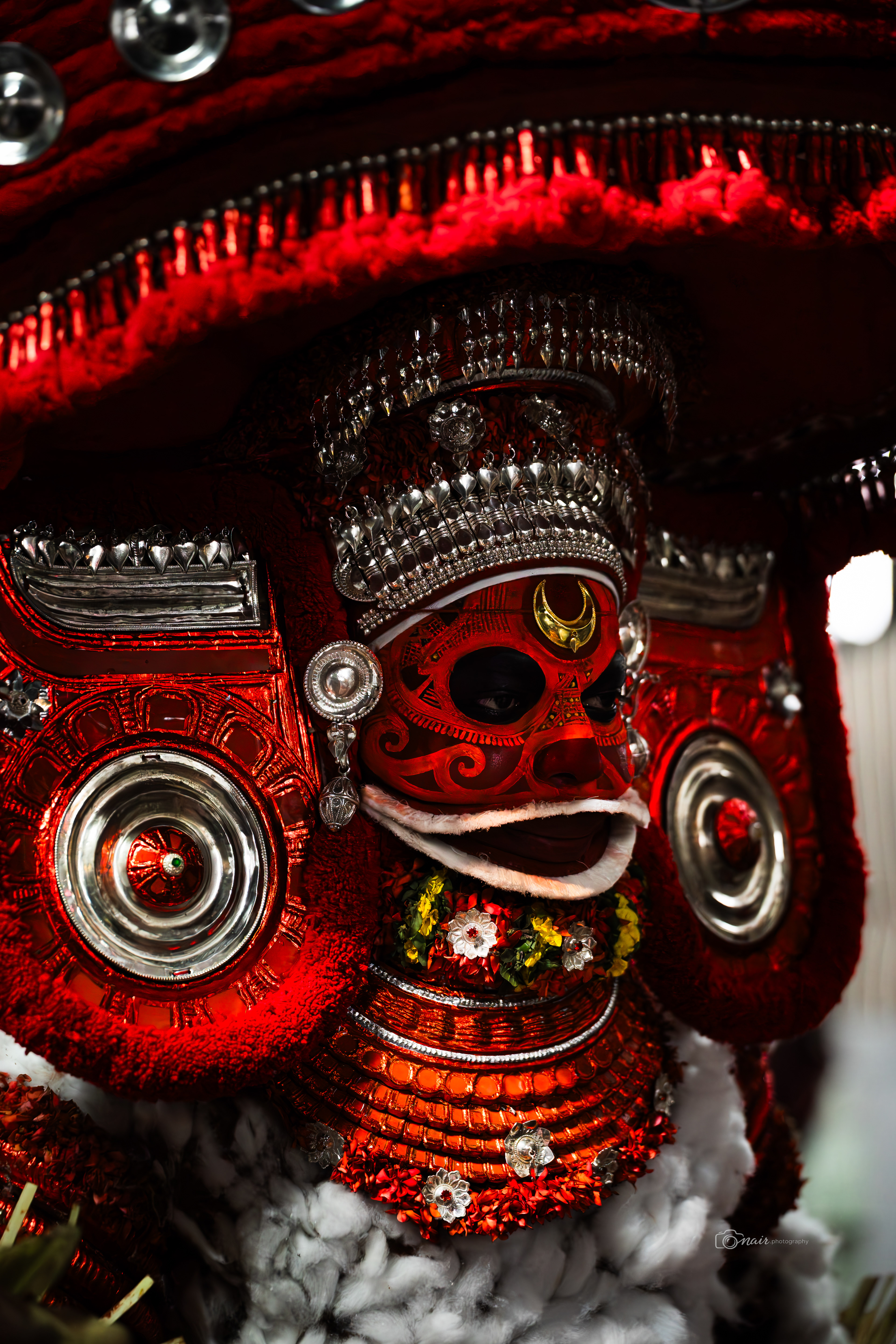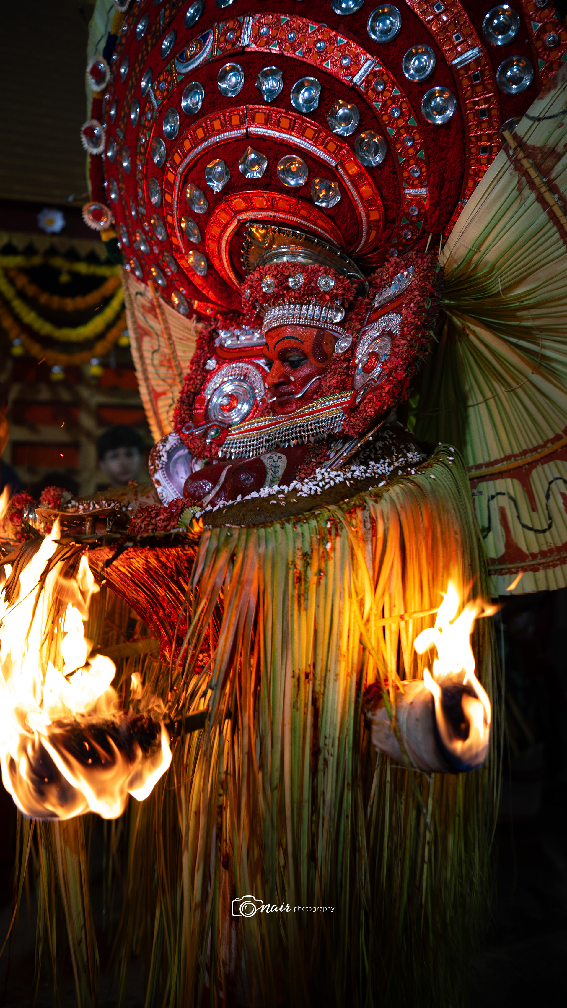 Her form is depicted with fire and ferociousness. It is believed that when in anger she performs the ferocious tandava dance. The person performing this theyyam can atimes go uncontrollable.