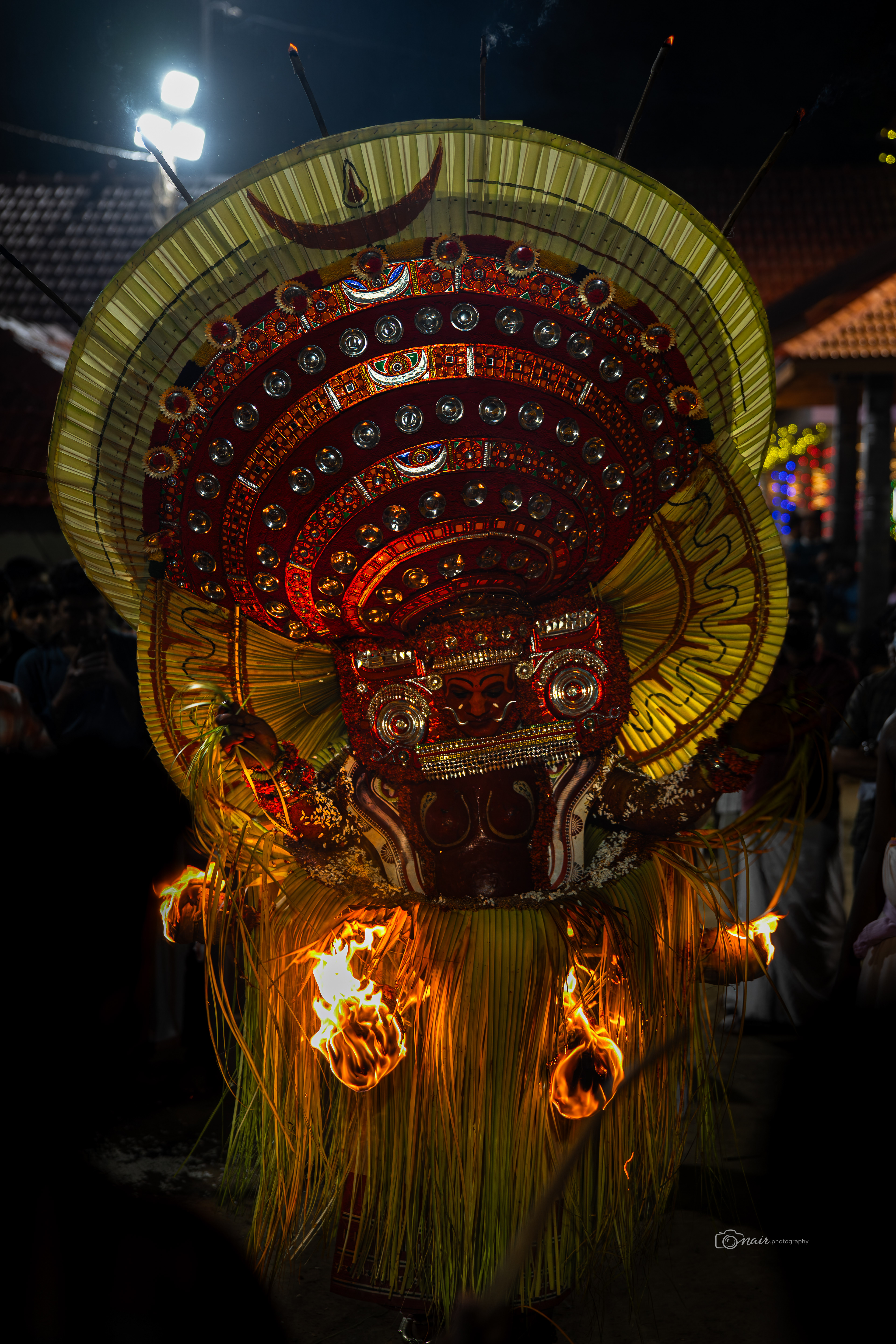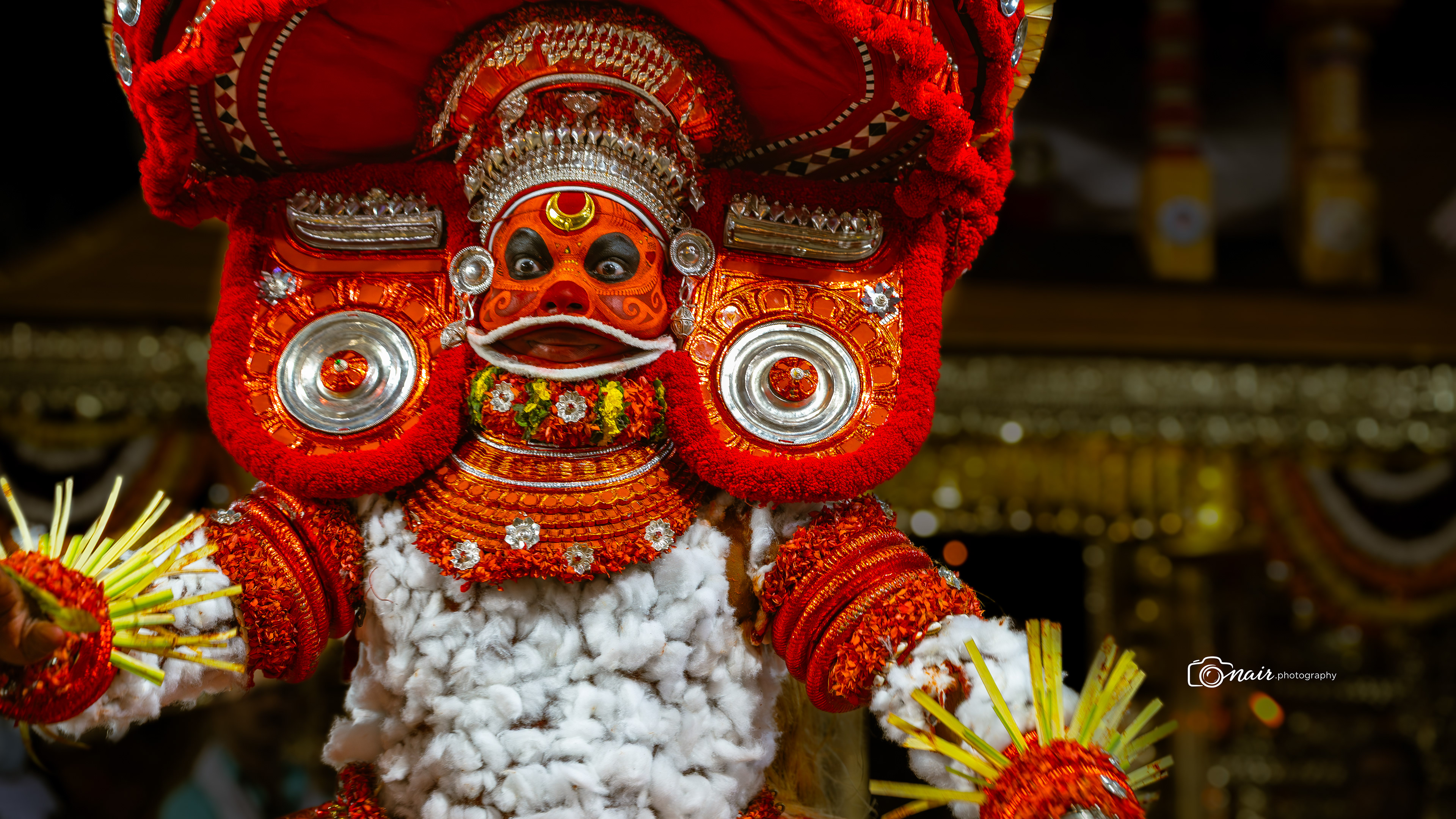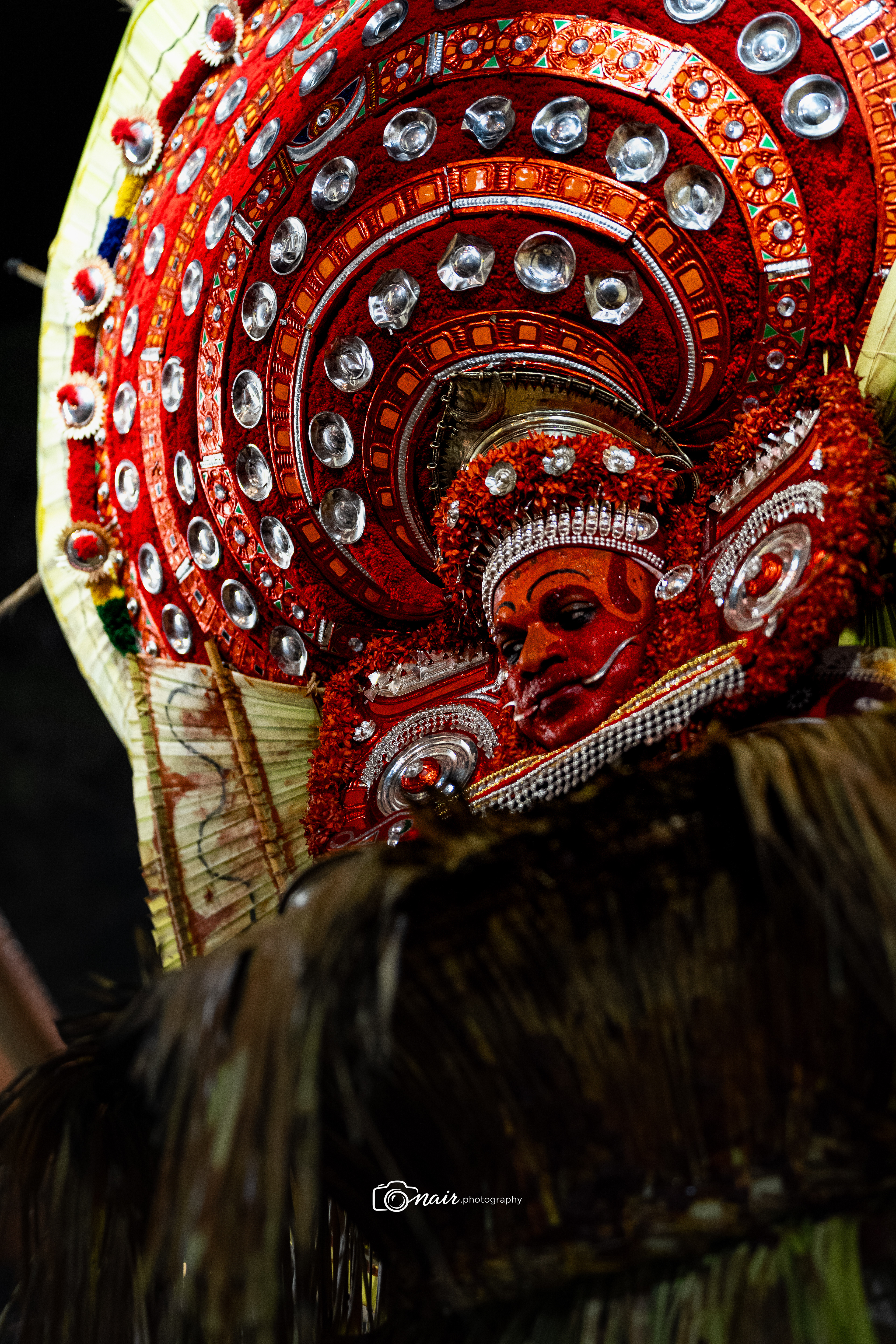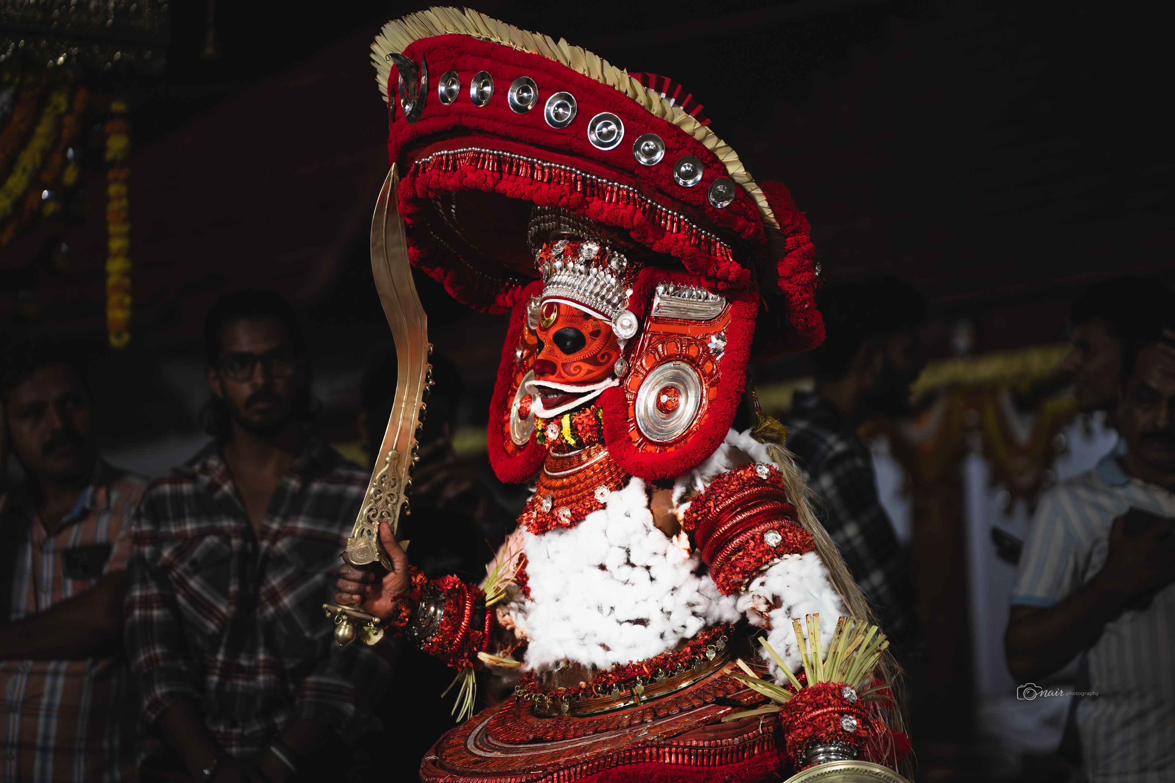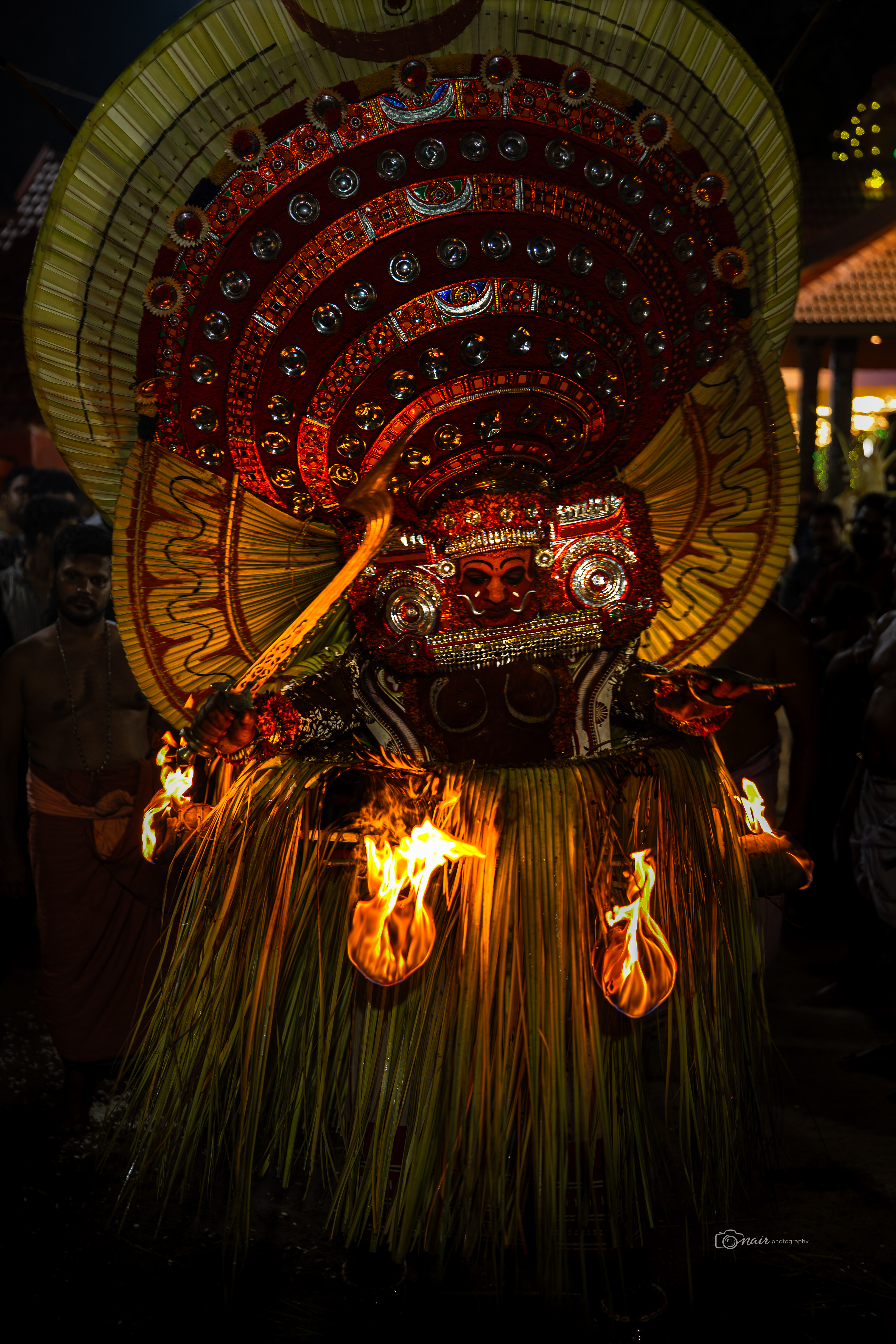 Her form is depicted with fire and ferociousness. It is believed that when in anger she performs the ferocious tandava dance. The person performing this theyyam can atimes go uncontrollable.