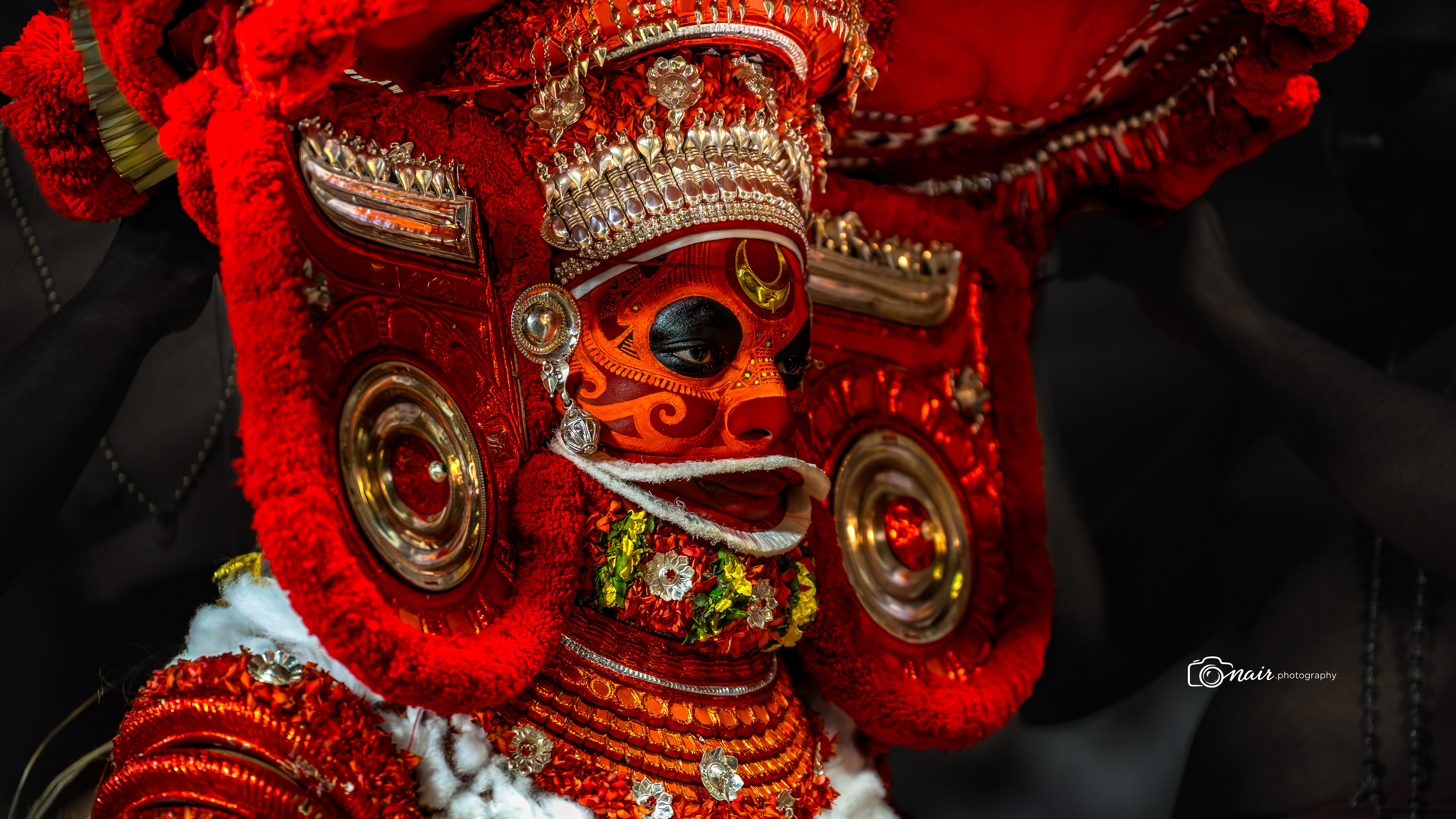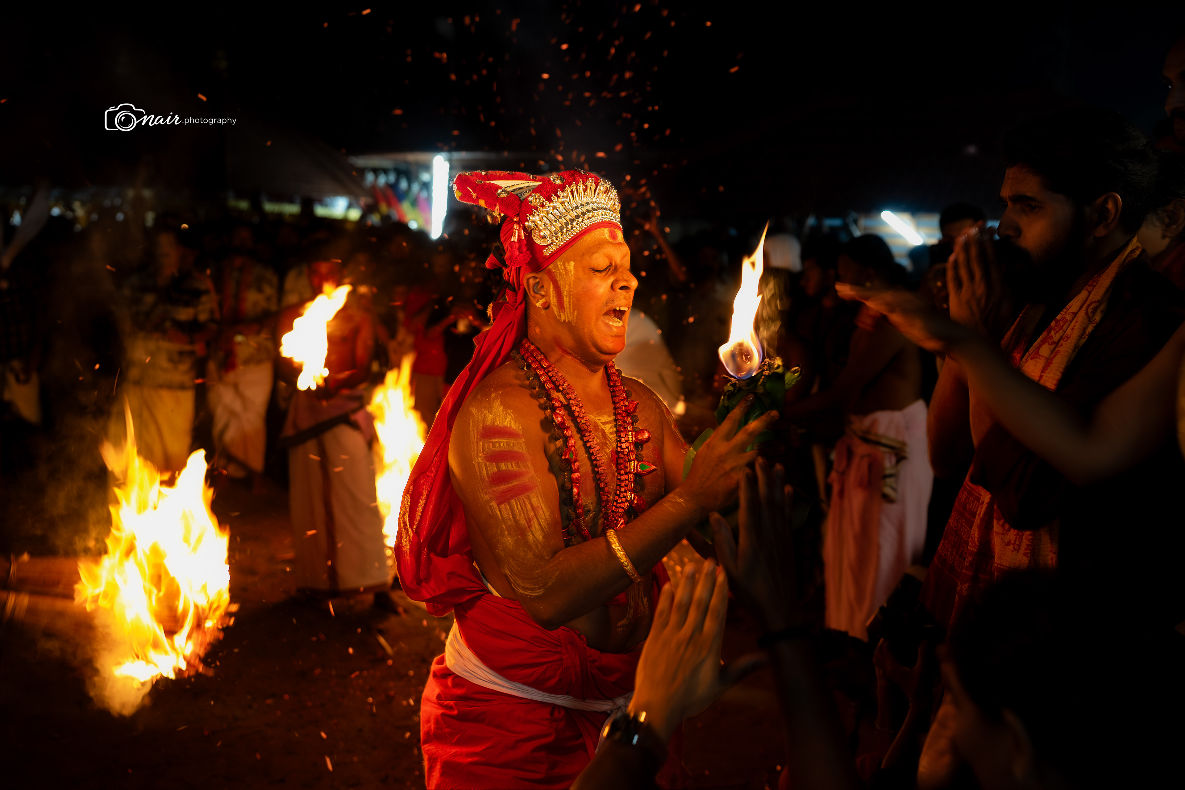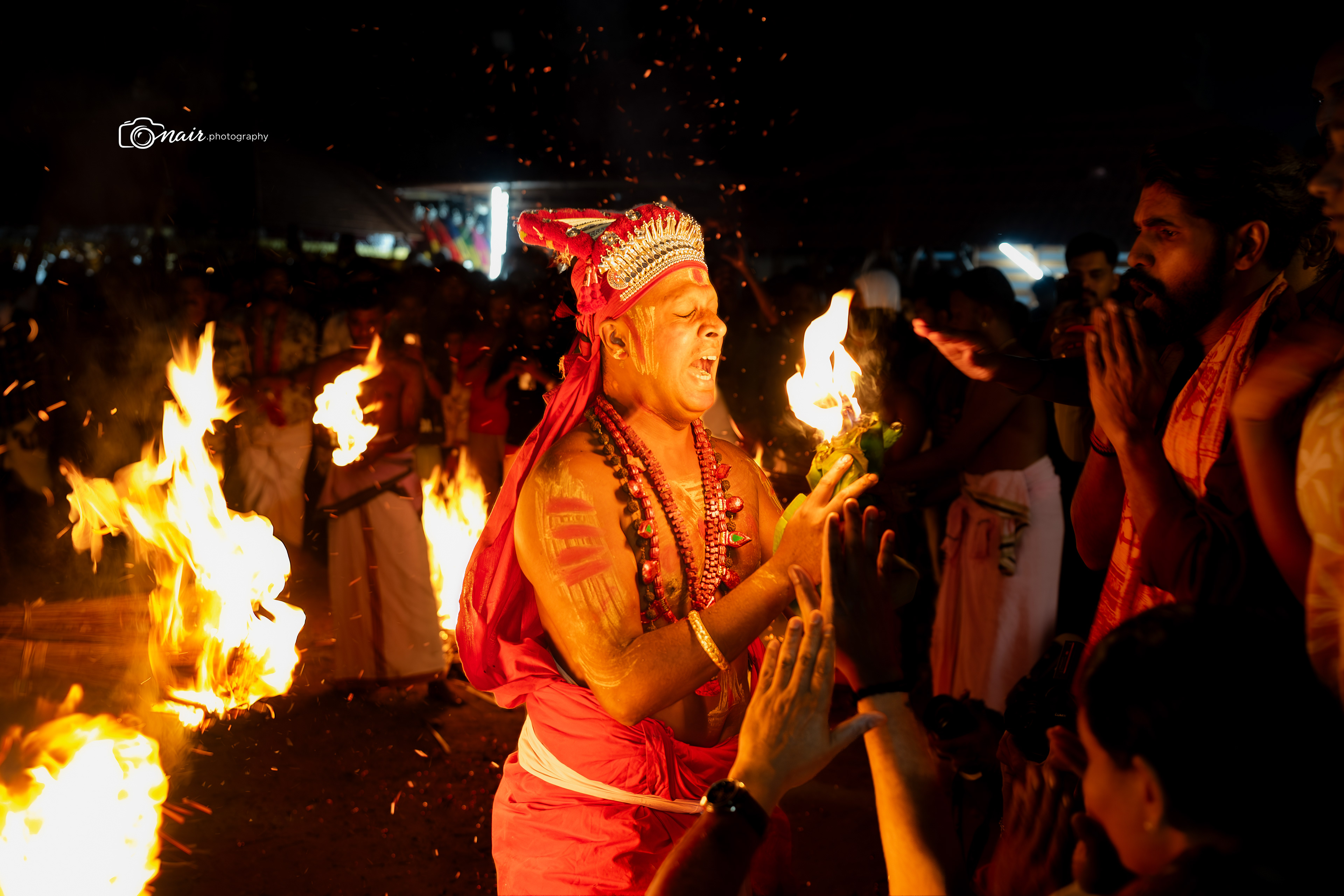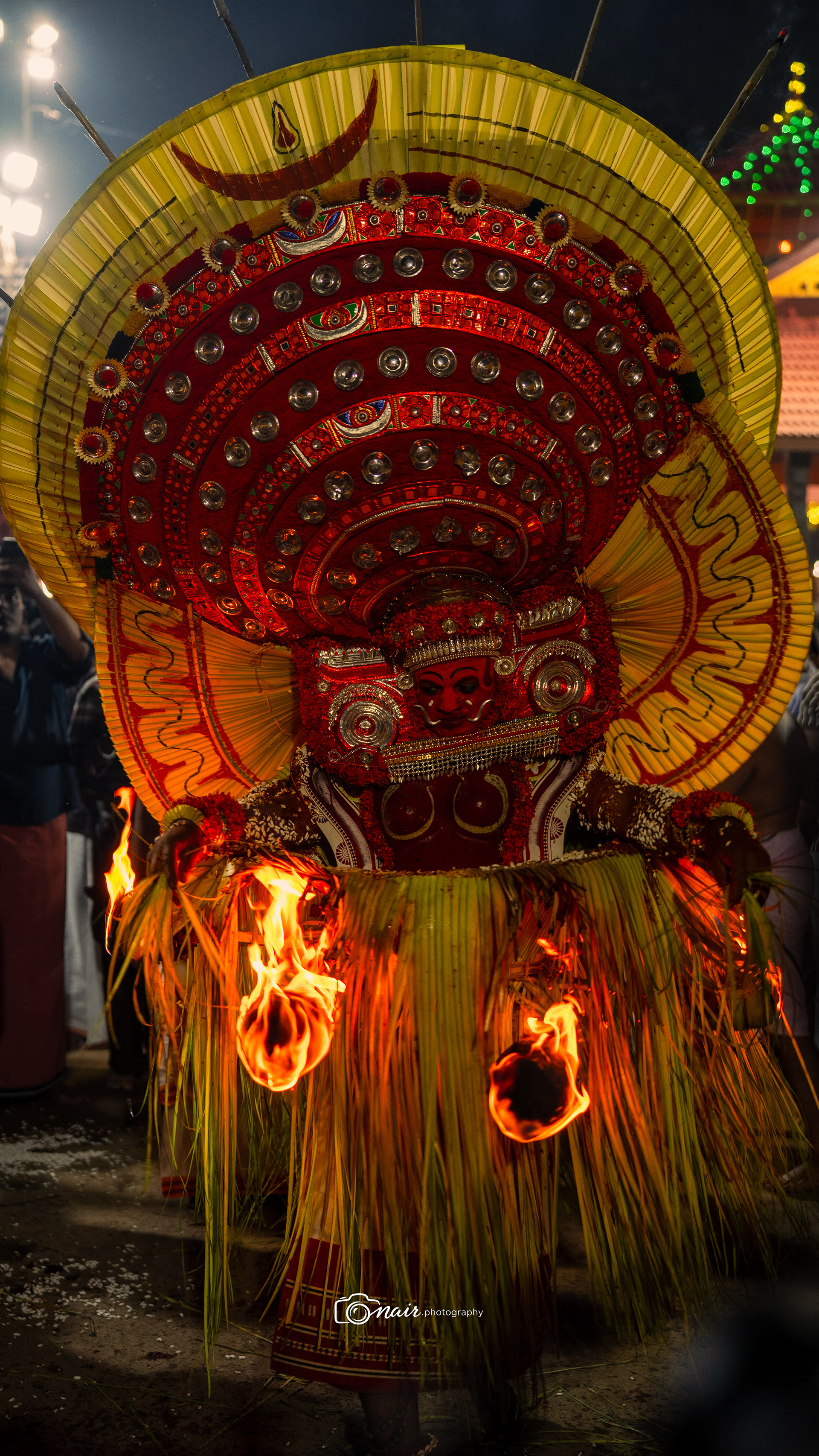 Her form is depicted with fire and ferociousness. It is believed that when in anger she performs the ferocious tandava dance. The person performing this theyyam can atimes go uncontrollable.